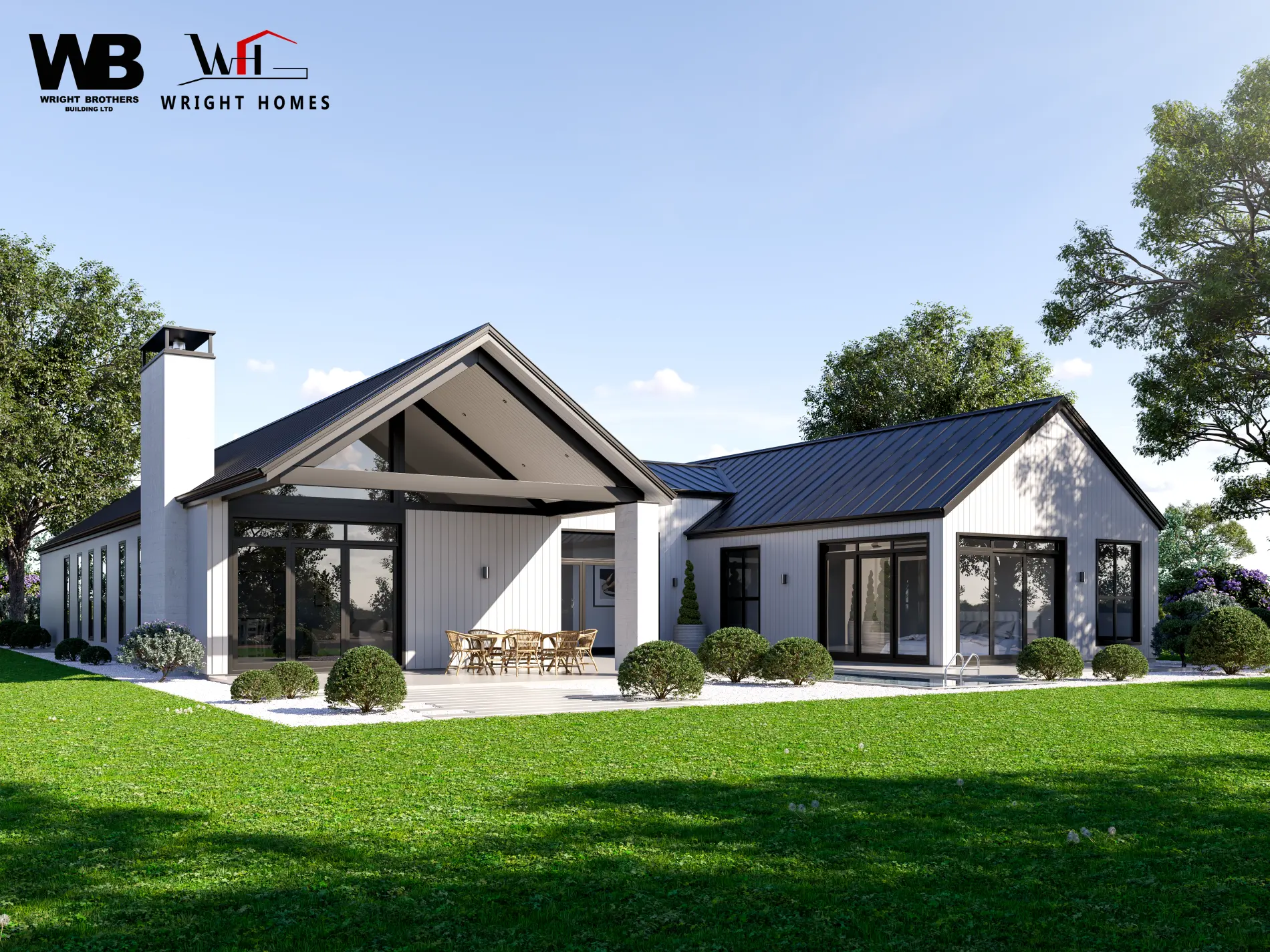This modern barn-style home blends contemporary design with traditional farmhouse charm, ideal for a family. It features four spacious bedrooms, an office, a media room, and a butler's pantry. Expansive windows fill the home with natural light, while the covered outdoor living area and open patio provide perfect spaces for family gatherings and relaxation. The clean lines, vertical siding, and sleek gable roofs create a striking exterior, making this home both stylish and comfortable.